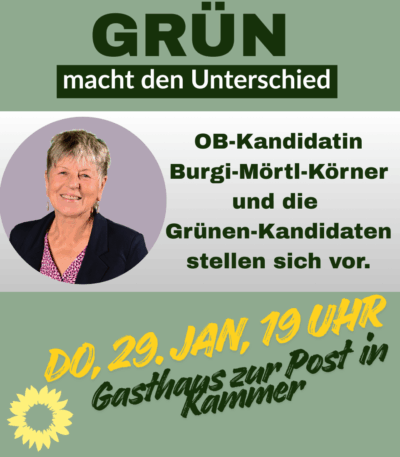 Am 8. März findet die Kommunalwahl statt. Wir Grünen treten mit OB-Kandidatin Burgi Mörtl-Körner an. Auf der Grünen-Liste bewerben sich noch weitere 29 engagierte Frauen und Männer für die Stadtratswahl….