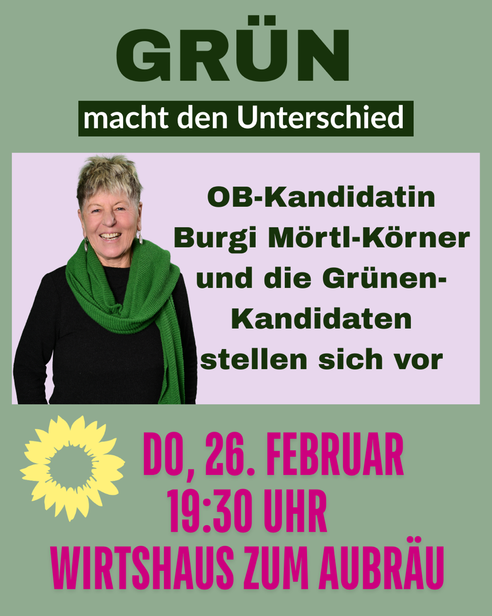 Am 8. März findet die Kommunalwahl statt. Wir Grünen treten mit OB-Kandidatin Burgi Mörtl-Körner an. Auf der Grünen-Liste bewerben sich noch weitere 29 engagierte Frauen und Männer für die Stadtratswahl. Am Donnerstag, 26. Februar habt ihr die Gelegenheit, die Traunsteiner Grünen im Wirtshaus Zum Aubräu kennenzulernen.