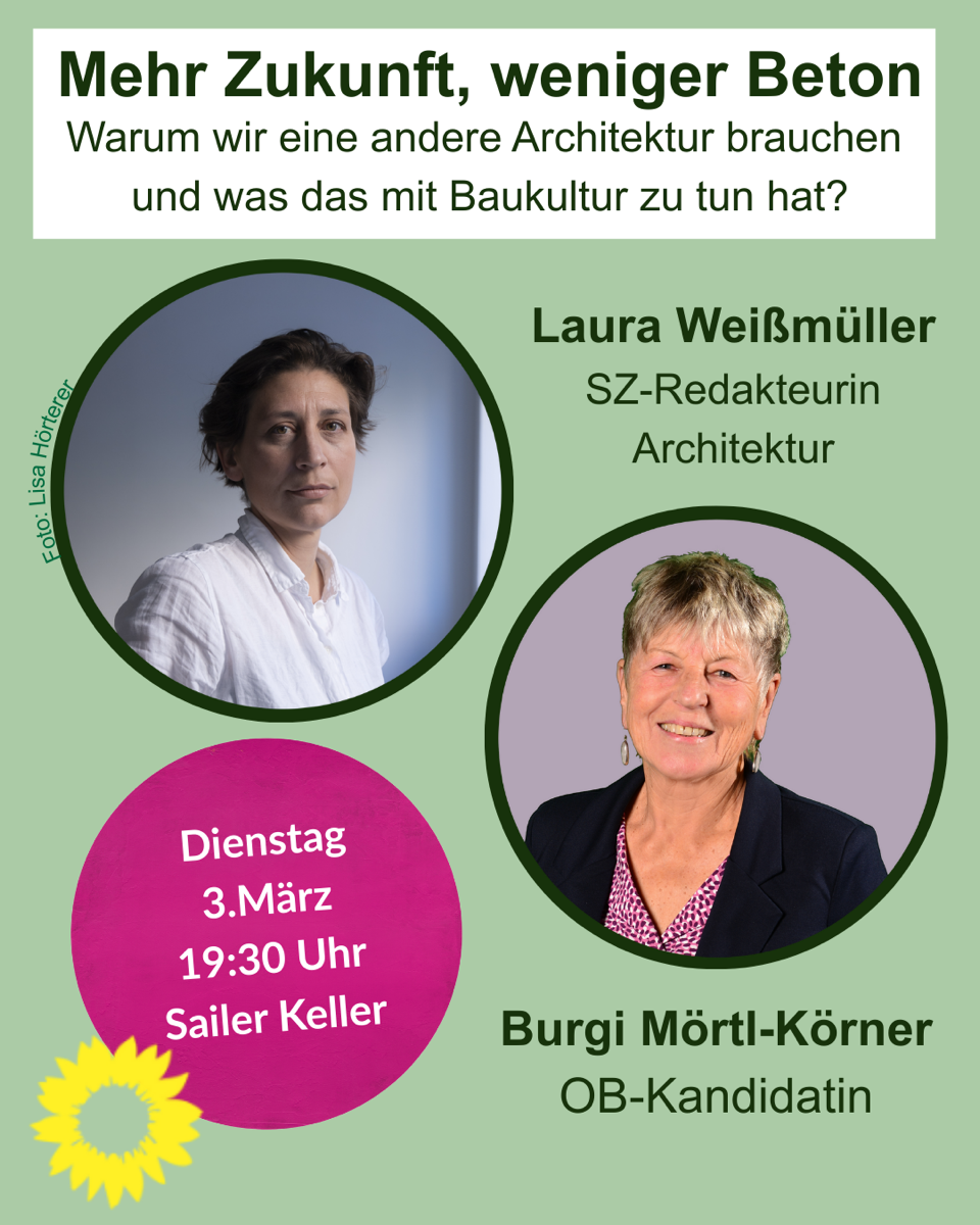 Nachdem die geplante Veranstaltung mit SZ-Journalistin Laura Weißmüller im Januar wegen Krankheit abgesagt werden musste, gibt es nun einen neuen Termin: Dienstag, 3. März, 19:30 Uhr im Sailer Keller.Die renommierte SZ-Journalistin Laura Weißmüller wurde für ihre Arbeit mehrfach ausgezeichnet. Im Jahr 2023 erhielt sie den Deutschen Preis für Denkmalschutz. Im Jahr 2024 den BDA-Preis für Architekturkritik. Seit 2020 lehrt Laura Weißmüller an der Technischen Universität München Architekturkritik. In der Süddeutschen Zeitung verantwortet sie den Bereich Architektur, Stadtplanung und Design. Besonders interessiert sie dabei die Frage, welche Art von Gestaltung es braucht, damit die Gesellschaft sich trifft und die Welt eine Chance hat.